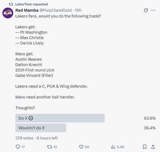 北京时间6月13日,湖人媒体RedMamba建议湖人与独行侠再度交易,他还询问了湖人球迷是否愿意跟独行侠做这笔交易。(来源也是约什-布哈所说佩林卡喜欢跟固定的伙伴进行交易)有63.6%的球迷觉得这笔交易可以做,有36.4%的球迷觉得不该做这笔交易。